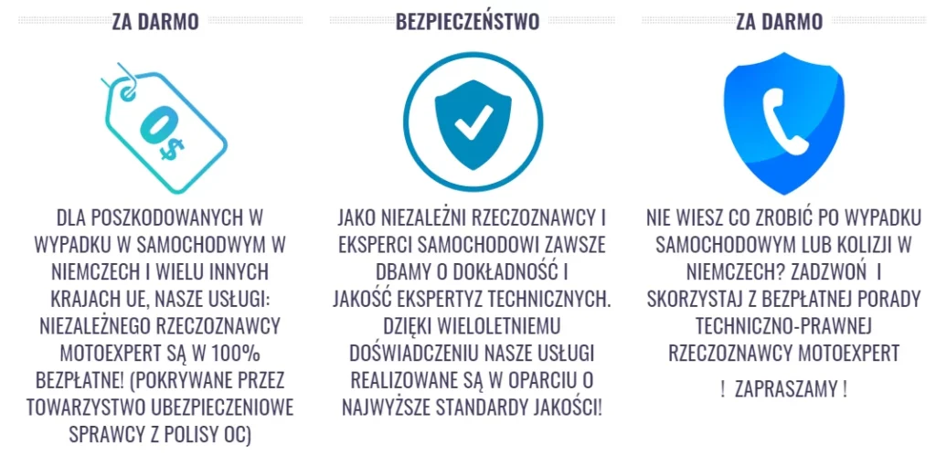 Rzeczoznawca samochodowy MOTOEXPERT Coburg Lichtenfels Sonnenberg Suhl Bad Neustadt jest ekspertem specjalizującym się w zakresie opiniowania szkód komunikacyjnych i kosztorysowania napraw pojazdów powypadkowych i pokolizyjnych. Na zlecenie Klientów, którzy zostali poszkodowani w zdarzeniu drogowym, do jakiego doszło nie z ich winy, rzeczoznawca MOTOEXPERT w Berlinie sporządza pełnoprawne i kompleksowe opinie techniczne dotyczące ustalenia zakresu oraz wartości szkód powstałych wskutek zdarzenia.